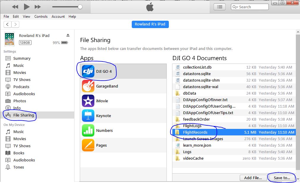 - Then go to File Sharing -> DJI Go 4 -> Flight Records -> Save To